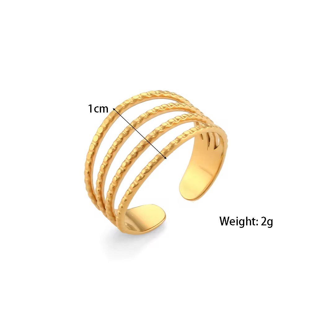 Bold lines meet elegant texture in the Aurora Ridge Ring — a radiant statement piece that instantly elevates your style. Featuring four parallel ridged bands, this open design ring is crafted from stainless steel and finished with a rich 18k gold plating. Non-tarnish and water-resistant, it offers both strength and shine, perfect for daily wear or special occasions. Lightweight and adjustable, it wraps your finger in effortless luxury.