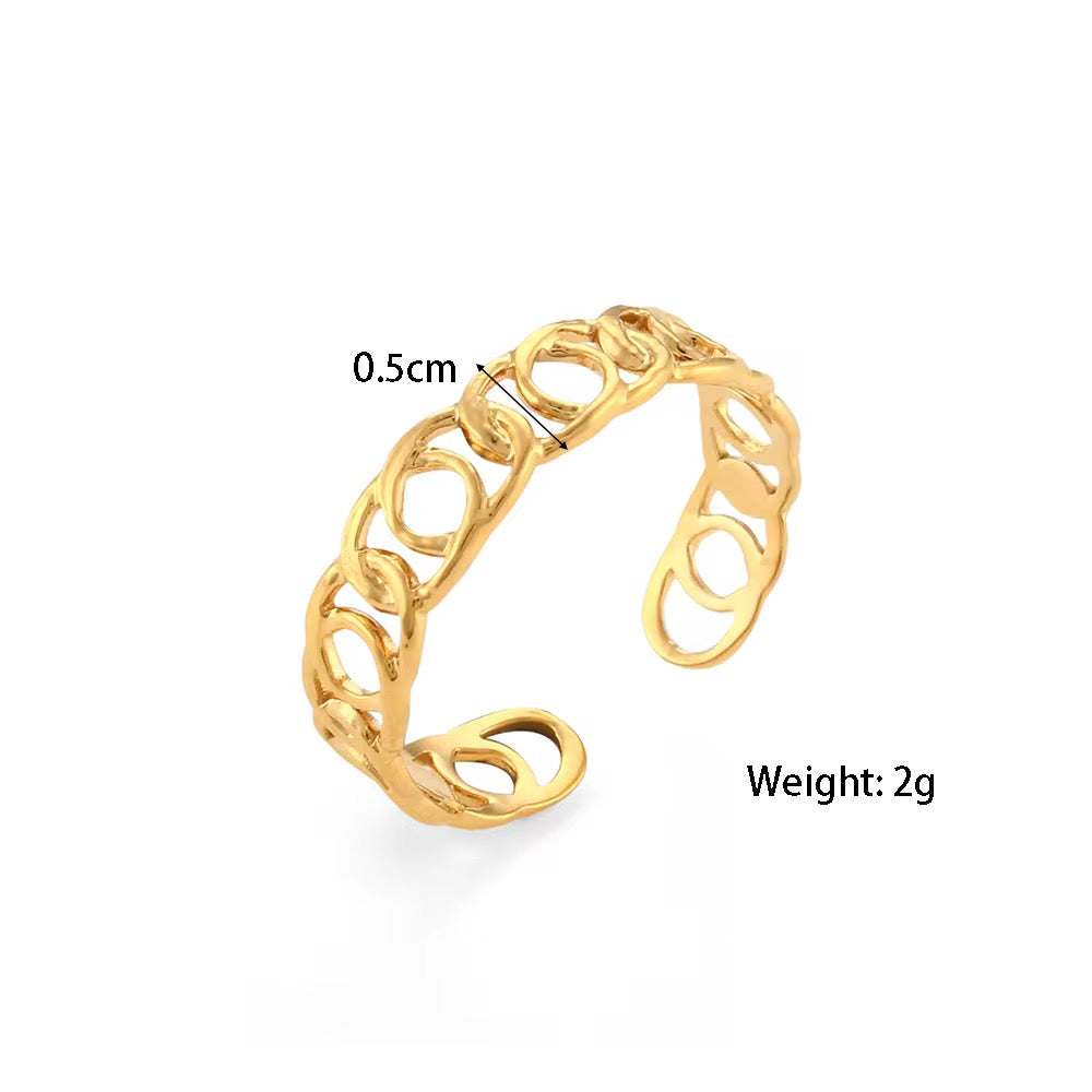 Flowing with effortless style, the Golden Wave Link Ring features a unique chain-like pattern with soft curves and open loops — giving it a light, airy feel with serious statement potential. Crafted from stainless steel and finished with a luxe 18k gold plating, it’s non-tarnish, water-resistant, and made to shine from day to night. Whether stacked or worn solo, this adjustable beauty adds a golden glow to your everyday.