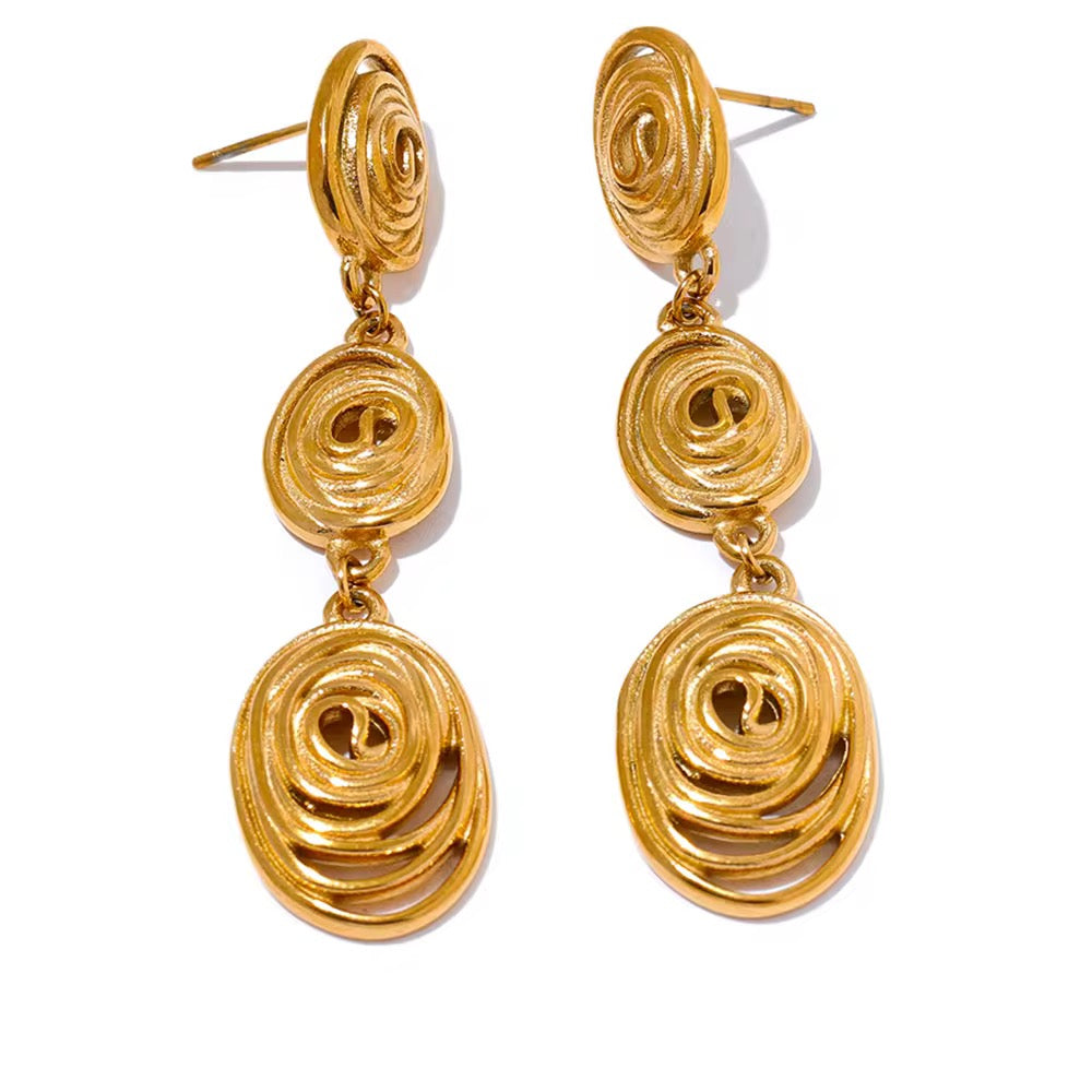 All eyes on you. The Orbit Spiral Drops are a dynamic trio of swirling golden ovals, crafted to catch light and command attention. Their abstract, fluid design evokes cosmic energy and modern art in motion. Made from non-tarnish 316L stainless steel and finished in 18k gold, these earrings are a powerful statement for bold hearts and creative souls.